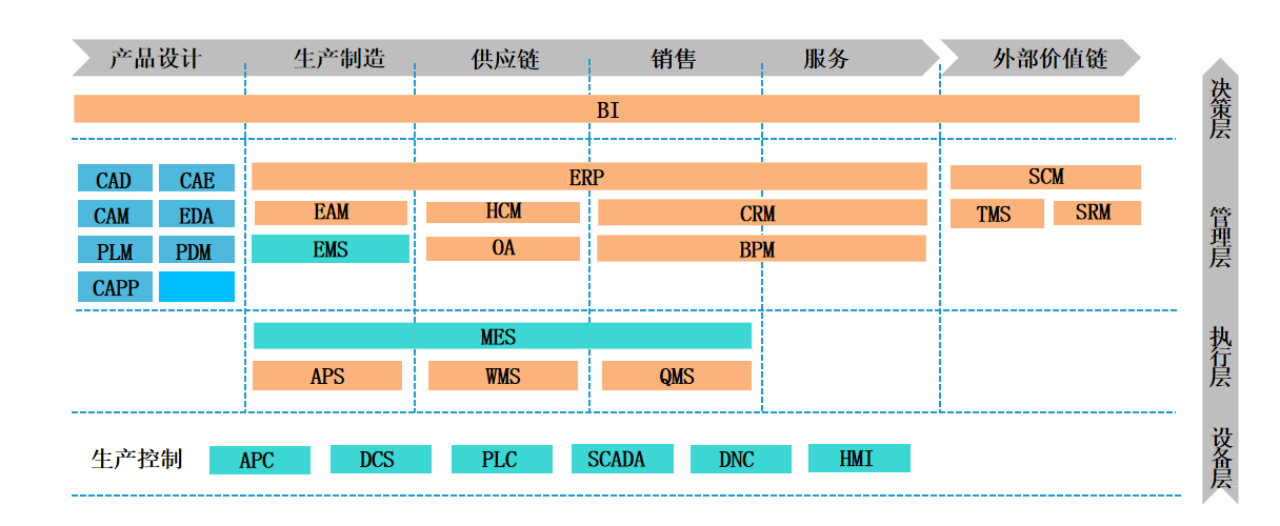 - 设备层:生产控制APC、DCS、PLC、SCADA、DNC、HMI